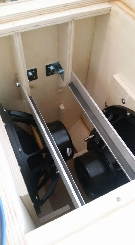 forgot to take many more build pics. here is one of the rear chamber. very well braced now with aluminium to mount the battery for portable system use. ![]() battery just fits with 2mm clearance. If I rejigged things a bit could get the amplifier in the rear chamber too, mounted on the rear access hatch. ![]() |