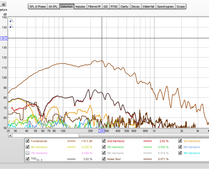 sounds pretty good. listened to some motown stuff and even with it crossed at 300Hz the vocals didn't sound too muddy. this is the on axis distortion plot with 28.3V ![]() |