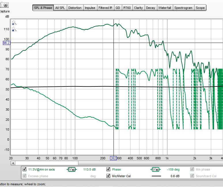 I haven't turned it into a ported horn yet. wanted to measure it a flh and possibly as a mass-loaded horn first and then compare the addition of the ports. I did one measurement at 28.3V @10m and would like to do them all like that but we heard shouts of "what the f*** was that from other people in the park". Maybe 11.3V @ 4m (+12dB) won't cause too much commotion. don't know why I didn't try without the 1/3 smoothing will also try and get some battery current readings playing some music material.