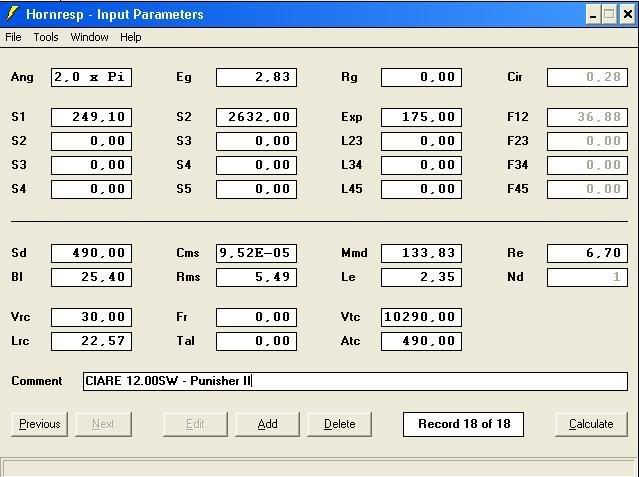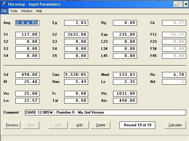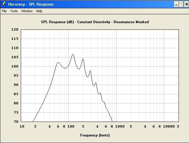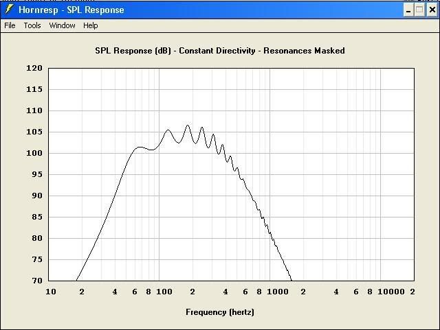 Hello Dr. Woofer I noticed that you used 2.0 X Pi for your radiation angle... I would recommend 1.0 X Pi if the horn cabinet is on the floor and against the wall...or 0.5 X Pi if it's corner loaded.... Also,...how certain are you of the VTC (volume throat chamber) number that you used?... I could be wrong but it seems a little high to me... Here are some graphs that I came up with: http://www.speakerplans.com/forum/forum_posts.asp?TID=11044...