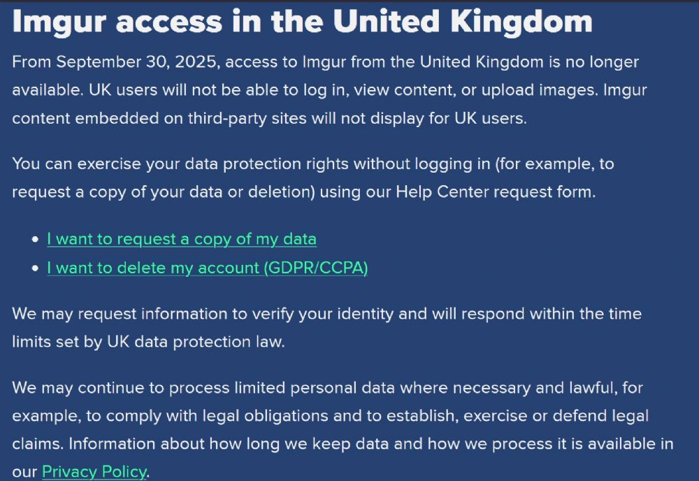 Not quite like photofucket, that was just a straight money grab. Imgur's owners have deliberately blocked access due to the UK regulator threatening to fine them over allegedly inadequate measures to verify the age of users and excessive retention of personal data.