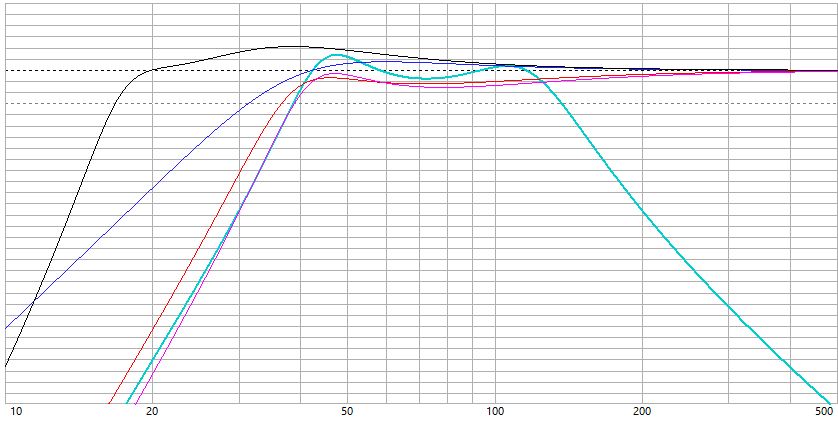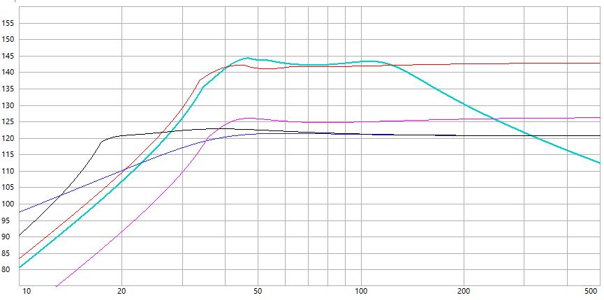 The plans describe it as 6th order Here are a few comparisons. All designs have two drive units. The turquoise is the PD24 modelled as 6th order bandpass the total cabinet vol’ is 720ltrs. My main aim was to try and match the response curve of the original design. The red curve is the same PD24 in a 600ltr reflex cabinet tuned to 38Hz The pink curve is a 12” FaitalPro driver in an 80ltr reflex cabinet tuned to 42Hz The purple curve is a 15” Dayton Audio Ultimax in a 250ltr closed cabinet The black curve is the same Dayton Audio in a 500ltr reflex cabinet tuned to 20Hz The predicted maximum SPL shows the monstrous output from the 24” drive units