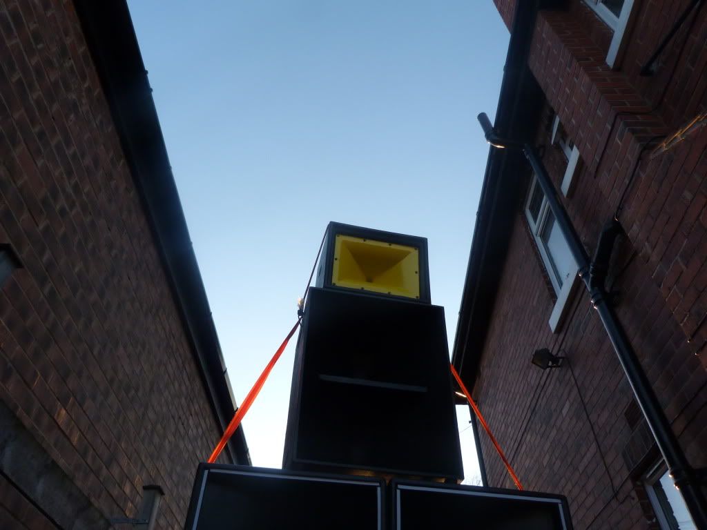 Interesting looking house install, pretty sure the peavys arnt designed to be flown (upside down with the grill reversed?)