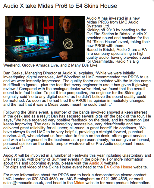 got one with a shagged encoder you can run off a PC if you want, just done a little garden party for a mate :- tiny Van 2 x TMS 4 mono with 2 subs mono off 2 x EP2500, 4 mons sends all with Mr soundWeb in control...