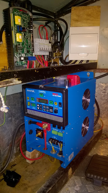 In with a newer 3000 watt Invertek inverter. We on average draw about 2.5 - 3.0 amps @ 240v running dj's / program material but with bands and lights that can creep up to 7 - 9 amps @ 240v,the old one ( Selectronics 1500 watt) was right at the limit of our current draw ( 7a constant) and would occasionally trip out under hard use. New one is super clever and can take incoming 240v and distribute to add to load or to charge the batteries. Will do a 6000 watt peak for a few seconds as well, so loads of headroom.