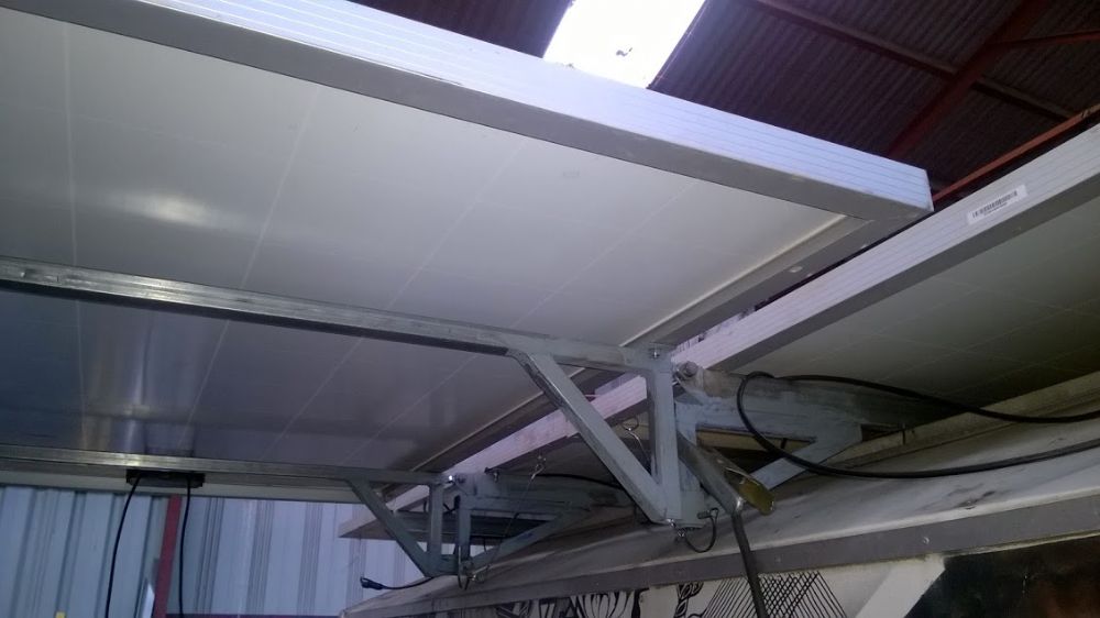 And on with a new set of 250 watt 24v panels.. 4 on the roof and 2 mounted on fold out frames down the side ..so a total of 1.5kw of power on the roof compared to the old 680 watt !