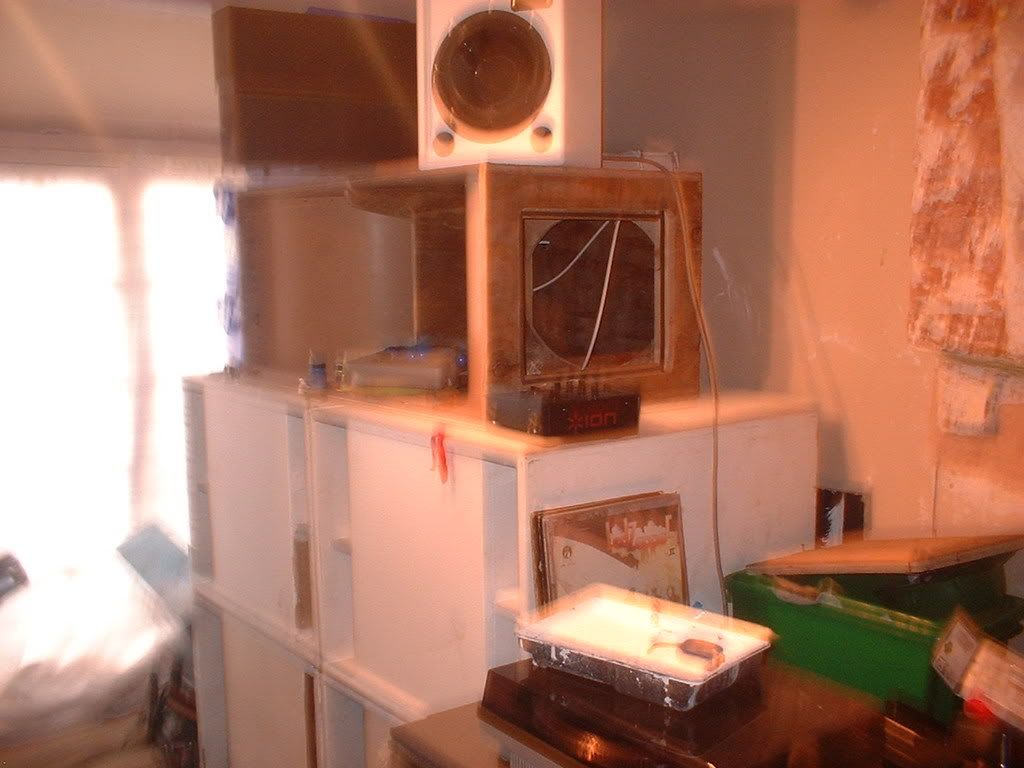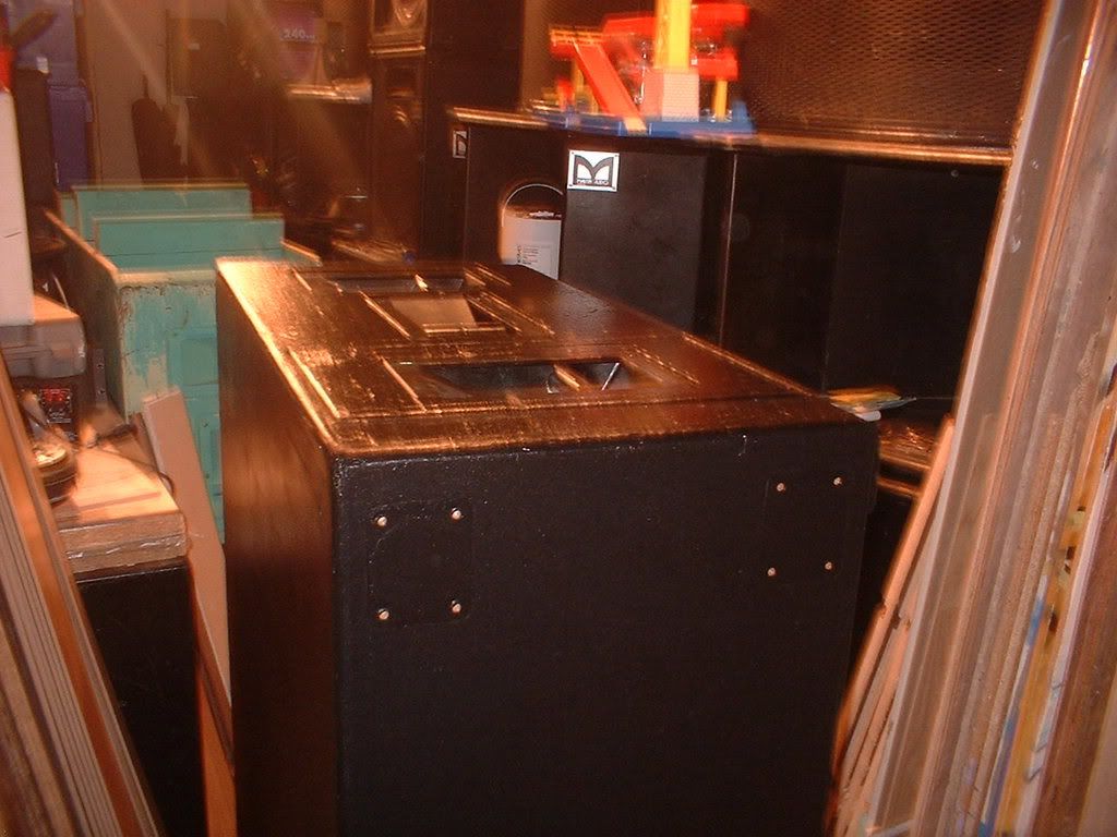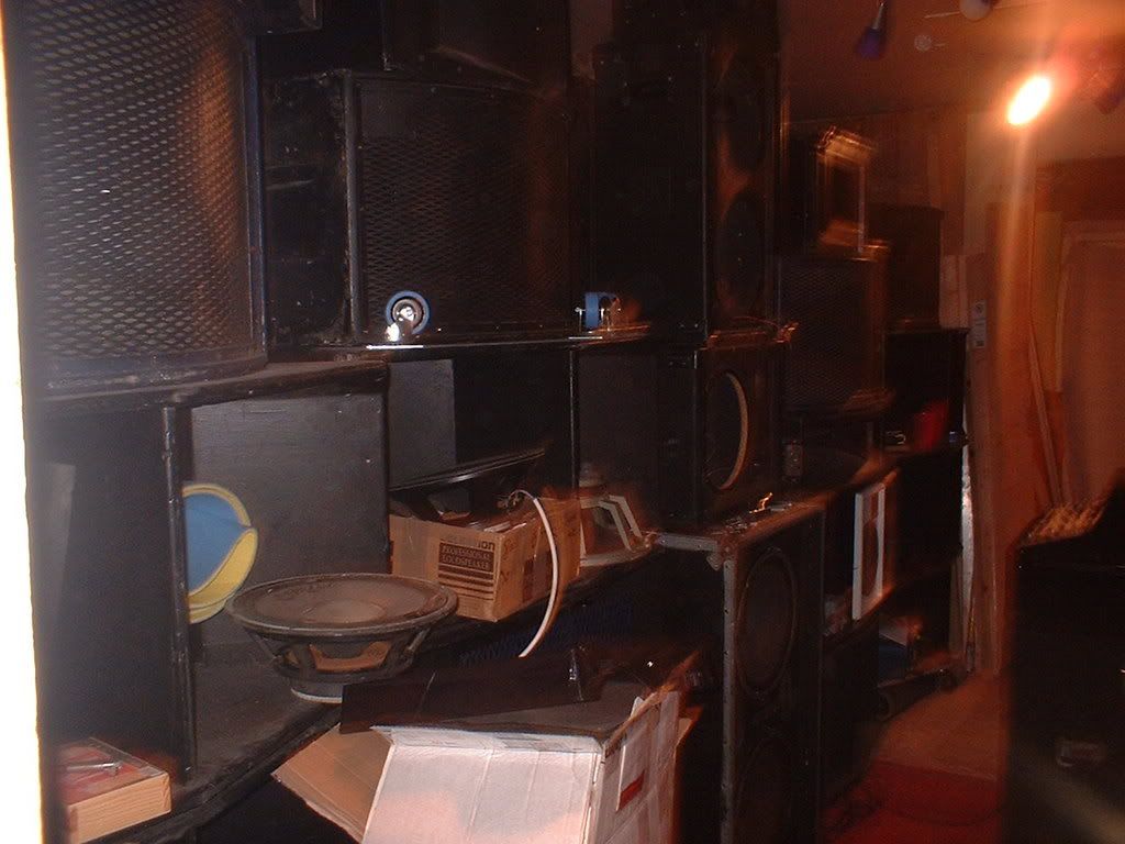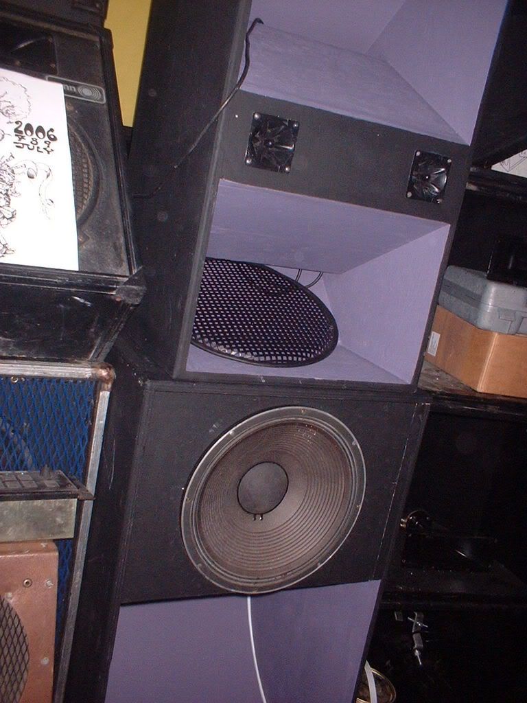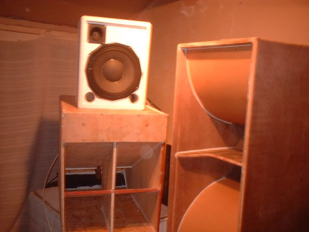 Things have changed a bit since these were taken!I usually plug in what is nearest the amps!Which at the mo are some sh*tty yamaha 215s for bass ,with a single 10 inch whizzer cone for tops on an infinate baffle...ie its stuck to the top of the amp by its magnet!Some pics over the last couple of years....