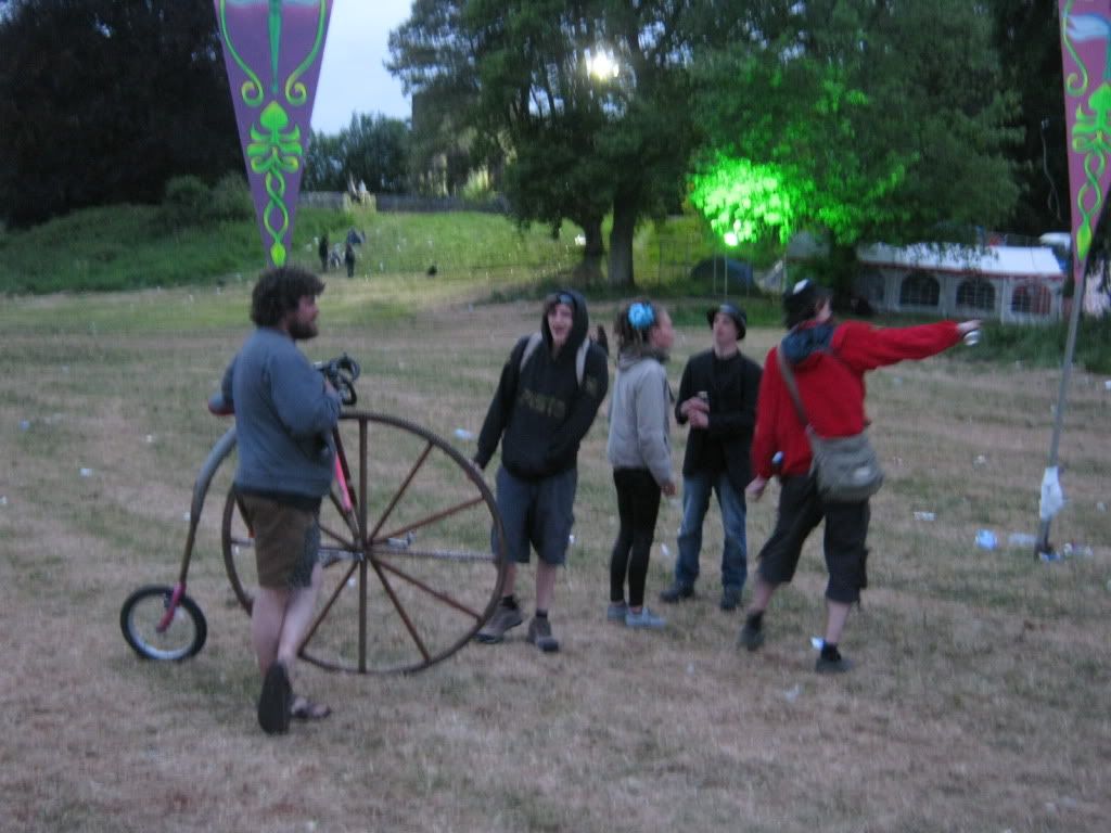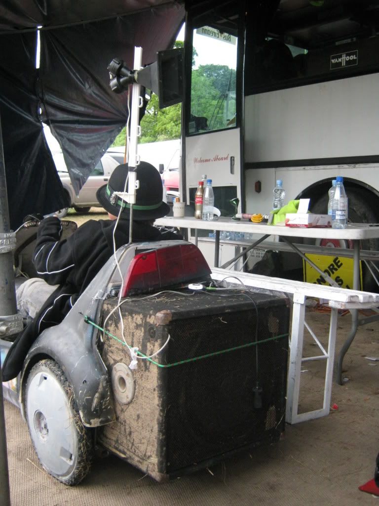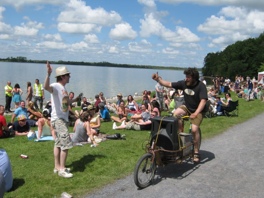 and now for the fun stuff... my good friend Paddy brought a few of his many crazy contraptions along, well worth posting.. one of his bike mounted systems.. a db opera off a car amp and battery. seen here cycling around playing The Ace of Spades to a crowd listening to Ricardo Villalaobobobs play 9 million hours of techno on the db setup pictured earlier on a lovely sunny saturday afternoon (it was a lovely afternoon really, i enjoyed the techno but didn't really pay attention)..
