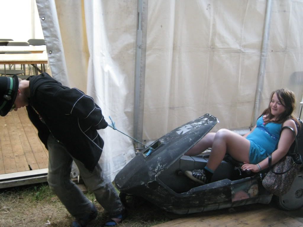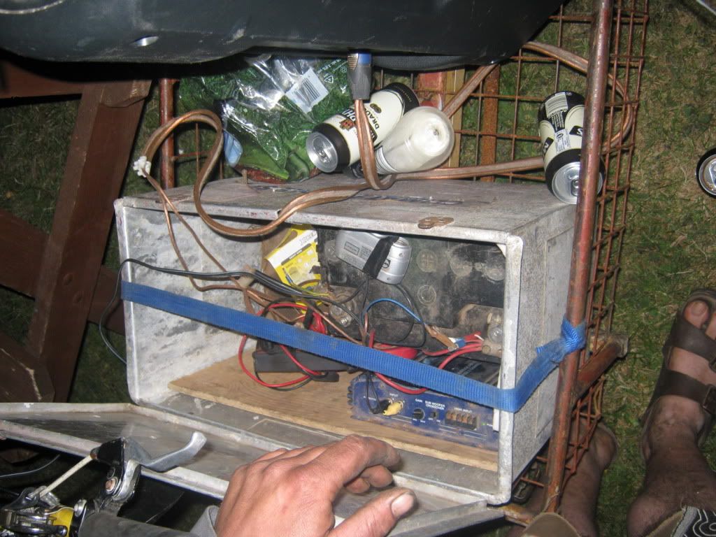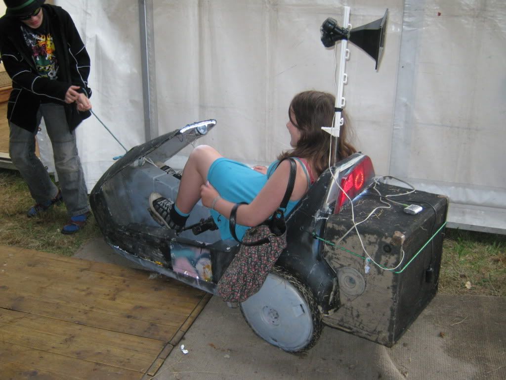 the sinclair C5.. has to be dragged around, the padals just power the sound... old peavy speaker stuck in the back, scientifically had the end sawn off to make it fit, p-audio sn15-b stuck in there, and a double piezo thing on a stick. good times! most fun system there and as always the last one to hold people dancing..