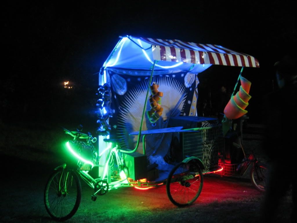 james also brought his rickshaw contraptacycle along too. 12" sub and random car drivers built into a box on the back. good times. in this pic, the other bike system seen earlier is actually leaning on the back so it looks a bit odd here...
