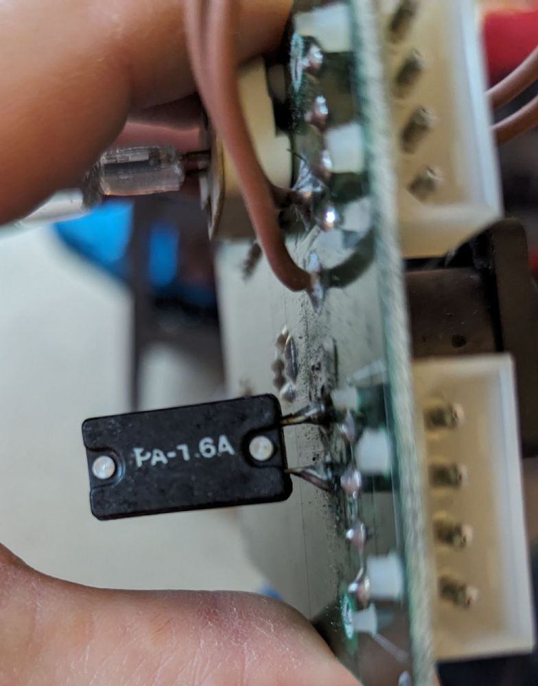Been using these on and off but noticed one of the speakers was cutting out randomly, traced it to a component on the input panel. If you touch it, it causes the cutouts. But can't find a replacement or any info on the component. Slow blow fuse? 1.6a?